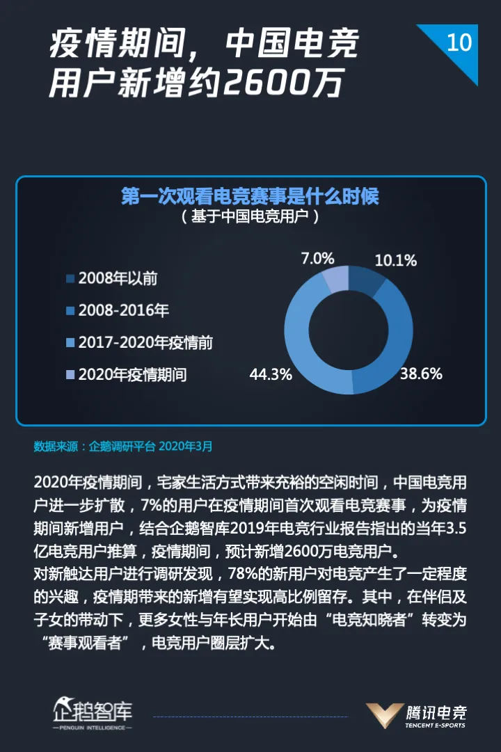其中,在疫情期间中国电竞用户新增约2600万,其中有7%的用户在疫情期间首次观看电竞赛事;