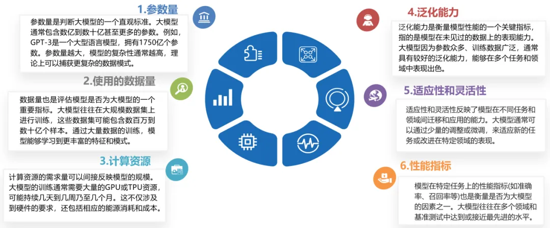 刘合院士认为可以从以下几个方面来判定大模型:参数量、使用数据量、计算资源、泛化能力、适应性、灵活性、性能指标等。
