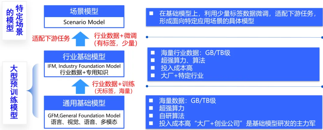 大模型在垂直领域的应用可以分为三个等级:通用基础模型、行业基础模型、场景模型。通用大模型基本是由一些大型IT公司和有实力的创业公司来研发,比如国外的OpenAI、DeepMind、谷歌、苹果等,国内的阿里、百度、腾讯、百川智能等。行业大模型是在通用大模型的基础上,加入行业数据和专家经验,研发的大型预训练模型。场景模型是利用通用大模型或者行业大模型研发的解决具体业务场景的模型。
