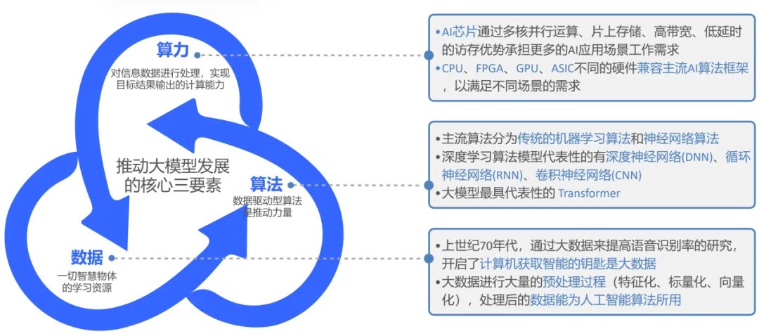 推动大模型发展的关键因素有三个:数据、算力、算法。