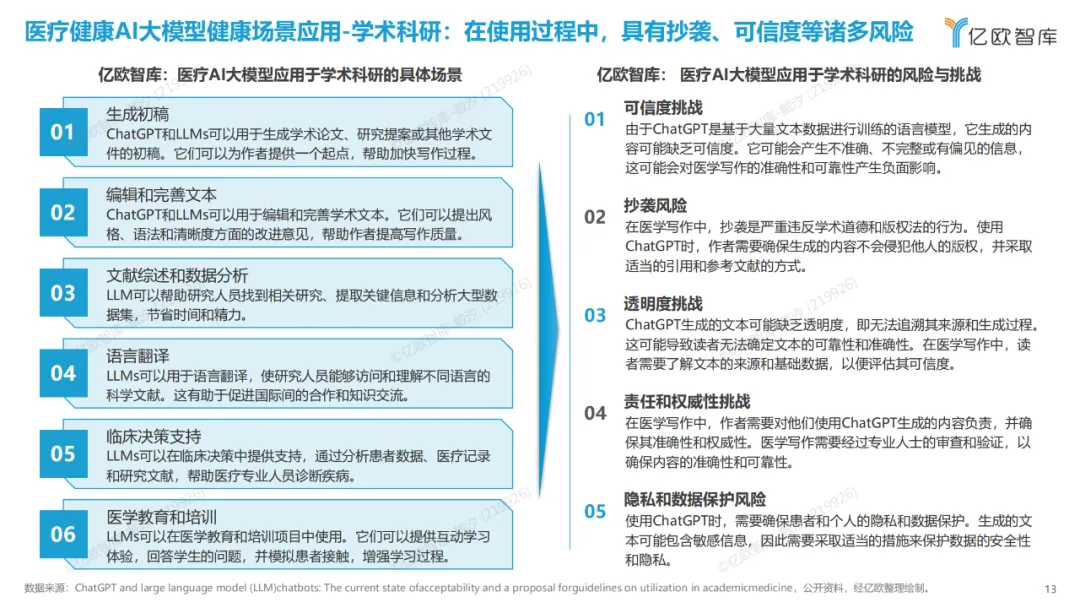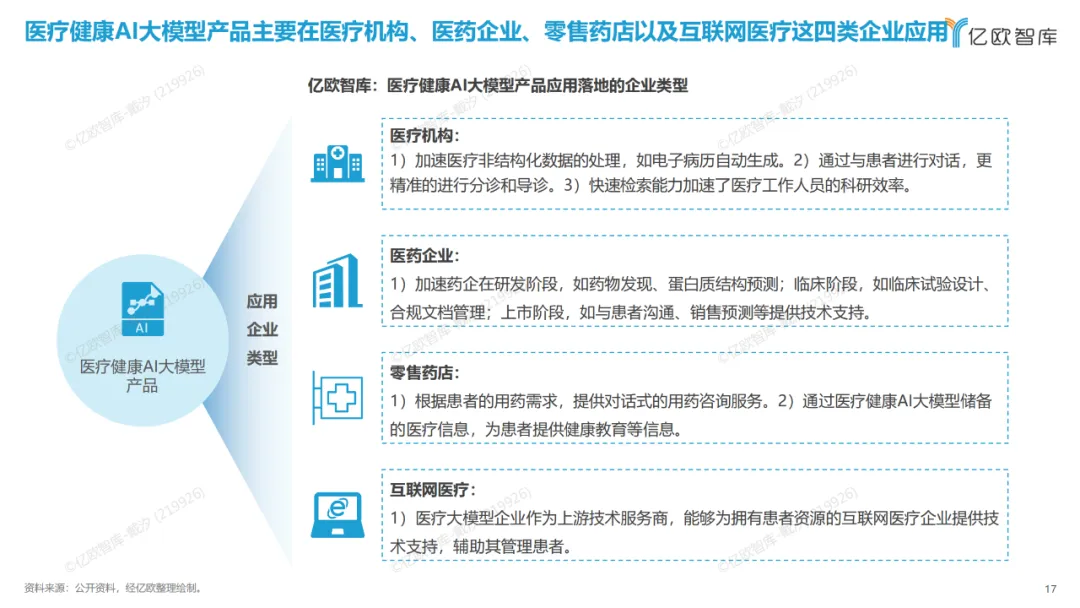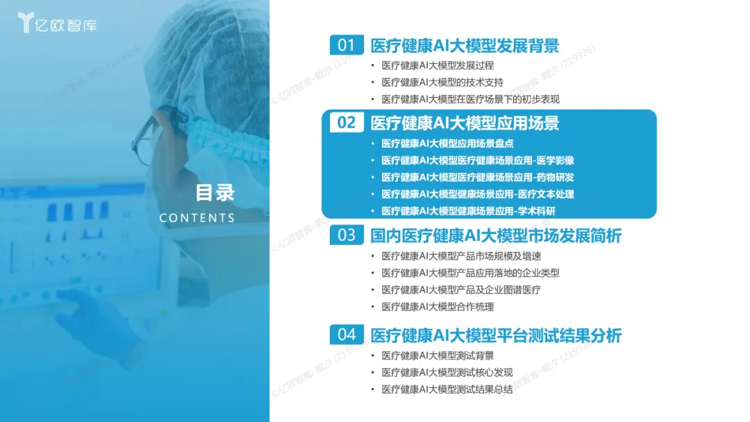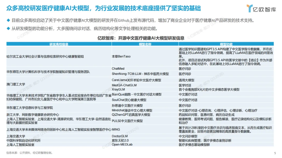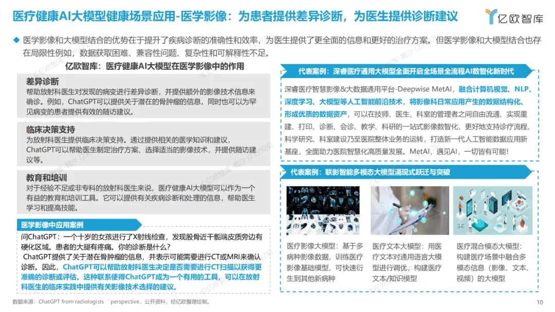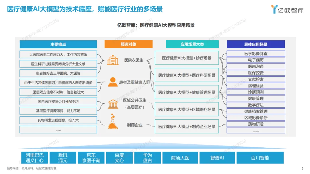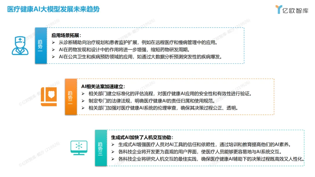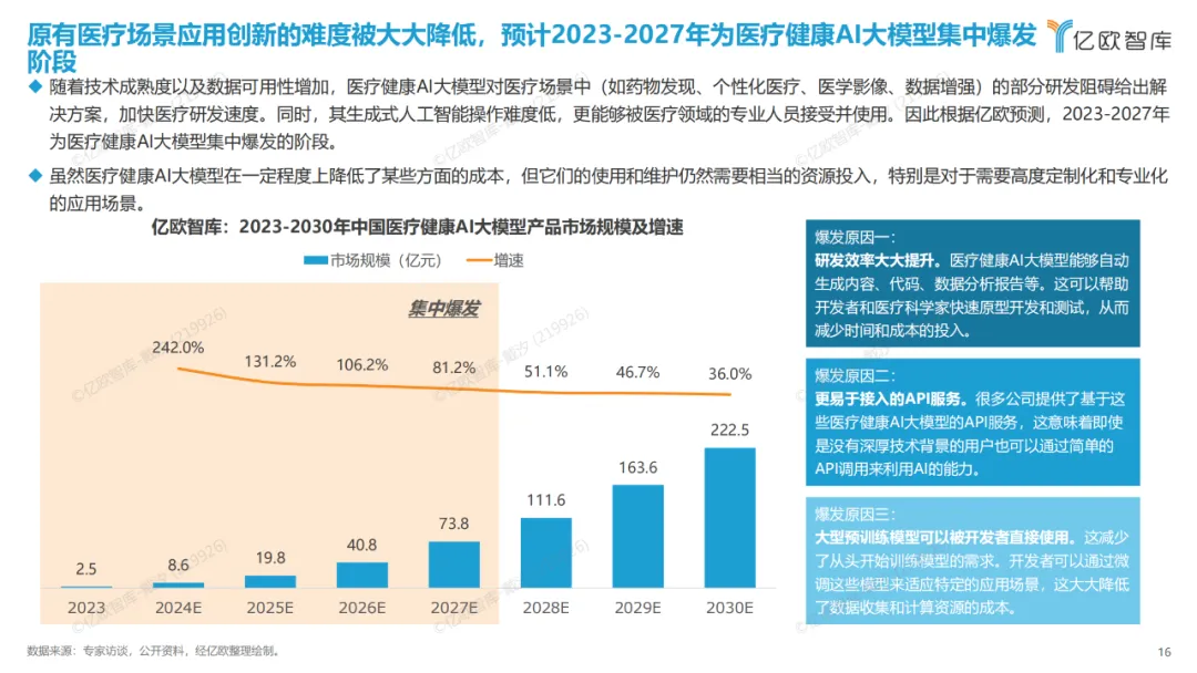 随着技术成熟度以及数据可用性增加,医疗健康AI大模型对医疗场景中(如药物发现、个性化医疗、医学影像、数据增强)的部分研发阻碍给出解决方案,加快医疗研发速度。同时,其生成式人工智能操作难度低,更能够被医疗领域的专业人员接受并使用。因此,报告预测,2023-2027年为医疗健康AI大模型集中爆发的阶段。虽然医疗健康AI大模型在一定程度上降低了某些方面的成本,但它们的使用和维护仍需要相当的资源投入,特别是对于需要高度定制化和专业化的应用场景。