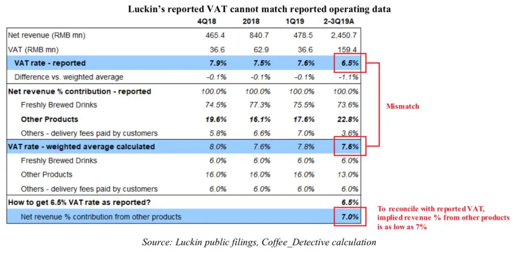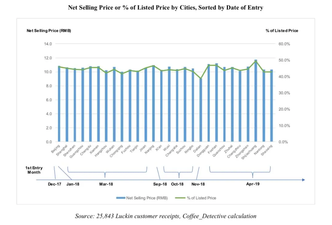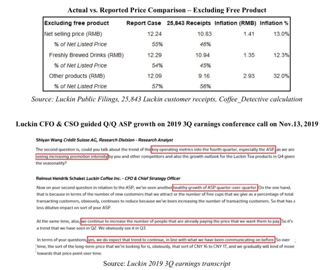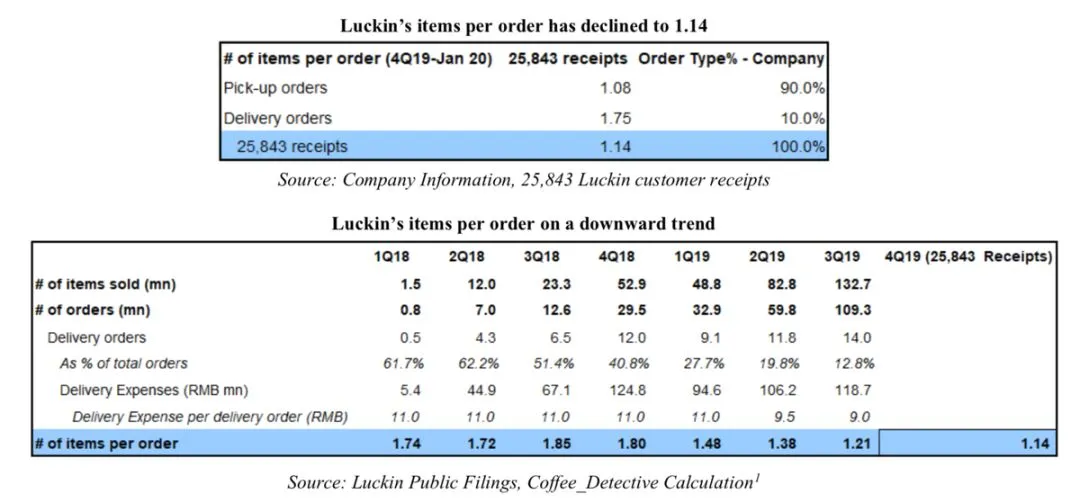 我们从2019年第4季度开始在线下追踪了981个店铺,每家门店单日销售商品数仅为263件。(瑞幸文件中显示2019年Q3每家门店单日销售商品数为444件,预计Q4位483-506件)我们动员了92名全职和1418名兼职人员在现场进行监控,成功记录了981个店铺日的客流量,覆盖了620家店铺100%的营业时间。门店选择方法基于城市和地点类型的分布,与瑞幸的4507家直营店预计2019年底开业的情况相同。瑞幸的4507家门店分布在53个城市,我们覆盖了38个城市,其中96%的门店都位于这些城市。通过分析瑞幸店铺的详细地址来确定店铺的位置类型:我们将店铺分为办公室、商场、学校、住宅、交通、酒店等。我们统计了每家店的客流量,并记录了从开门到关门的视频,平均每天11.5小时。当我们再次检查人流量和记录的视频时,如果视频监控丢失了超过10分钟的片段,我们就会丢弃一整天的数据。我们的成功率只有54%,因此所有成功的数据都是100%的完整。这是2019年11月23日通知商店经理注意提货数量激增的证据。然而,这里有一个聪明的部分:公司管理层可能认为,越来越多的投资者和数据公司开始跟踪他们的订单号码,作为尽职调查过程的一部分,所以“跳跃式订单”是误导投资者的简单方法。为了了解线上订单膨胀的规模,我们随机选取151家线下跟踪店-天来跟踪他们的线上订单。我们在商店营业时间的开始和结束时分别下了一份订单,以获得当天的在线订单数量。我们发现,同一家商店在同一天的在线订单数量膨胀范围从34到232,平均每天106个订单或72%的离线订单平均。 Luckin’s “Items per order” has declined from 1.38 in 2019 2Q to 1.14 in 2019 4Q瑞幸的“单品”从2019年第二季度的1.38下降到2019年第四季度的1.14件。从2019年第四季度开始,我们收集了来自45个城市2213家商店10119名顾客的25843张收据。25,843张收据显示,每个订单的提货和送货单分别为1.08张和1.75张,或混合1.14张(99%置信水平)。这标志着每笔订单的单品数量持续下降,从2018年第一季度的1.74件下降到2019年第一季度的1.14件。这一趋势可以归因于送货单贡献的下降,因为人们自然倾向于购买更多的物品来满足免费送货的要求。瑞幸表示,通过走访我们的商店,我们发现,大多数上门收件的顾客只买一种现磨饮料,因为在大多数情况下,优惠券只能用于订单中的一种商品。根据公司介绍和管理层沟通,交付订单的比例确实从2018年第一季度的61.7%下降到2019年第三季度的12.8%,1月初进一步下降到约10%。We gathered 25,843 customer receipts and found that Luckin inflated its net selling price per item by at least RMB 1.23 or 12.3% to artificially sustain the business model. In the real case, the store level loss is high at 24.7%-28%. Excluding free products, actual selling price was 46% of listed price, instead of 55% claimed by management.我们收集了25843份客户收据,发现瑞幸将每件商品的净售价至少提高了1.23元或12.3%,人为地维持了这种商业模式。在实际情况中,商店层面的损失高达24.7%-28%。不包括免费产品,实际销售价格为上市价格的46%,而不是管理层声称的55%。瑞幸报告称,2019年第三季度每件商品的净售价为11.2元人民币。在2019年11月13日的收益电话会议上,瑞幸的首席财务官兼首席运营官Reinout Schakel为2019年第四季度指引了更高的价格。然而,我们的25843张收据显示的净售价只有9.97元人民币,也就是说,与报告的情况相比,通货膨胀率为12.3%(99%的置信水平和1%的统计误差,意味着我们99%确定价格在9.87- 10.07元人民币之间,1%的误差。不包括免费产品,现磨饮料和其他产品的售价分别为10.94元和9.16元,与报道的情况相比,通货膨胀率分别为12.3%和32%。不包括免费产品,实际销售价格为上市价格的46%,而不是管理层声称的55%。在上述收益电话会议上,瑞幸的首席财务官Reinout Schakel回避了有关加大促销力度的问题。然而,我们的收据显示,他们甚至从2019年第四季度开始向现有用户提供免费的饮料券,而之前只向新用户和邀请他们的用户提供免费的饮料券。据推测,每一家公司提交的文件中,免费项目的比例正在下降。瑞幸的首席财务官Reinout Schakel表示,他们继续增加已经在支付他们希望支付的价格的人数。我们的收据显示正好相反,即使在成熟的市场,有更成熟的客户,有效价格停滞在10元人民币,不包括免费产品。每件商品的净售价与经营月份之间不存在正相关关系。瑞幸首席财务官Reinout Schakel在1月份花旗银行最近的一次会议上提到,超过63%的客户为每杯咖啡支付15-16元人民币。在2019年第三季度公司的报告中,他们指出63%的产品售价超过零售价的50%。然而,这些都太好了,不可能是真的,而且与我们的收据发现相矛盾。我们的收据显示,只有28.7%的商品以超过标价50%的价格售出。事实上,大部分商品的售价都在标价的28%-38%之间。瑞幸的核心客户对价格仍然非常敏感。只有39.2%的顾客支付的价格高于12元人民币,18.9%的顾客每杯咖啡支付的价格高于15元人民币。为什么ASP很重要?如果投资者还记得Luckin在演讲中对商店盈利能力的敏感性分析,他们会发现ASP是商店盈利能力的关键因素。他们指出,在每家店每天400件商品的情况下,每件商品售价16元人民币,店级利润率可高达28.4%。在管理层的分析中,较接近实际情况的每股收益低于12元的下限,不知怎么被忽略了,这代表着一个更加艰难的盈利前景。在实际情况下,即每家店每天263件,净售价为9.97元,根据管理报
