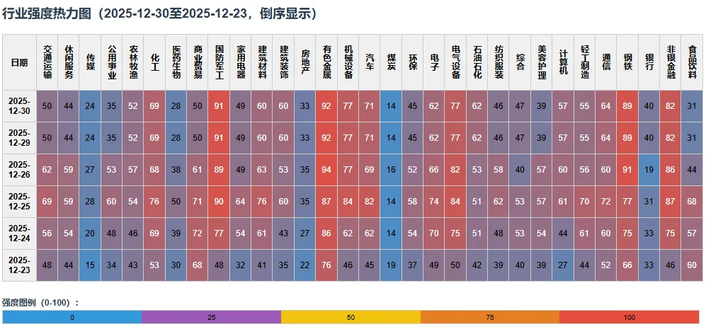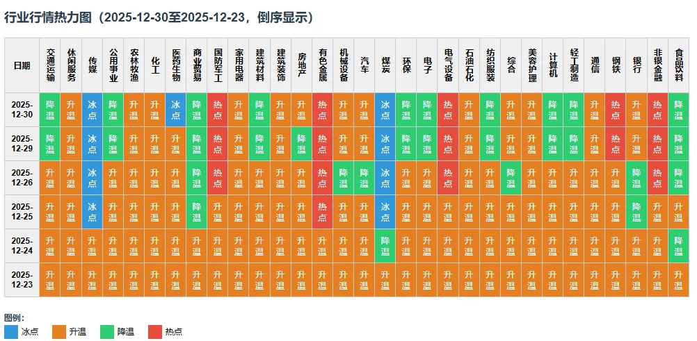 有效交易日:6 天 覆盖行业:31 个 冰点天数占比:9/186(4.84%)升温天数占比:131/186(70.43%)降温天数占比:31/186(16.67%) 热点天数占比:15/186(8.06%)03