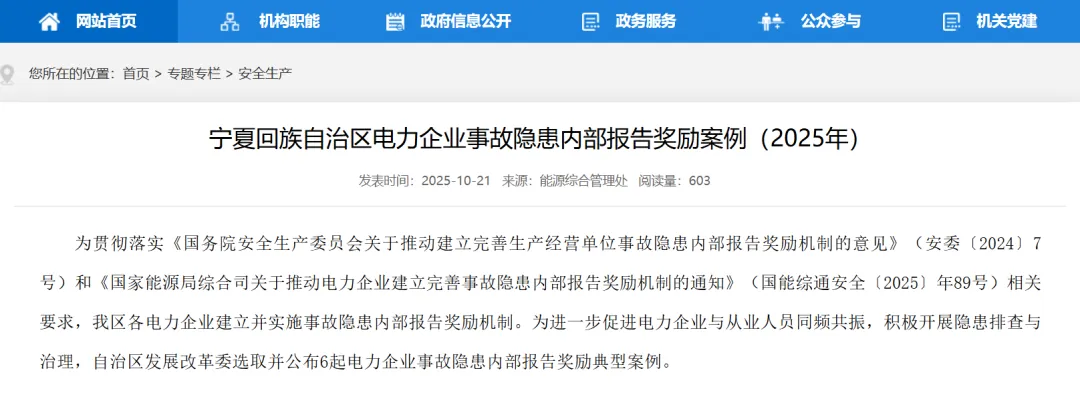 宁夏回族自治区电力企业事故隐患内部报告奖励案例(2025年)