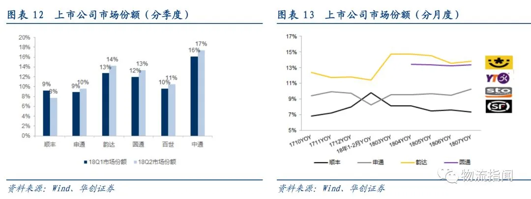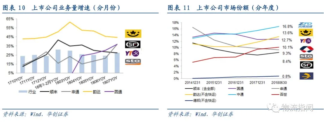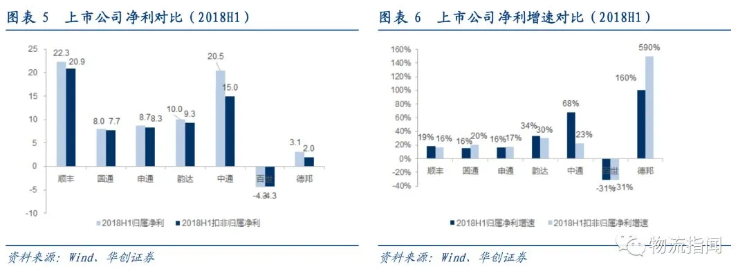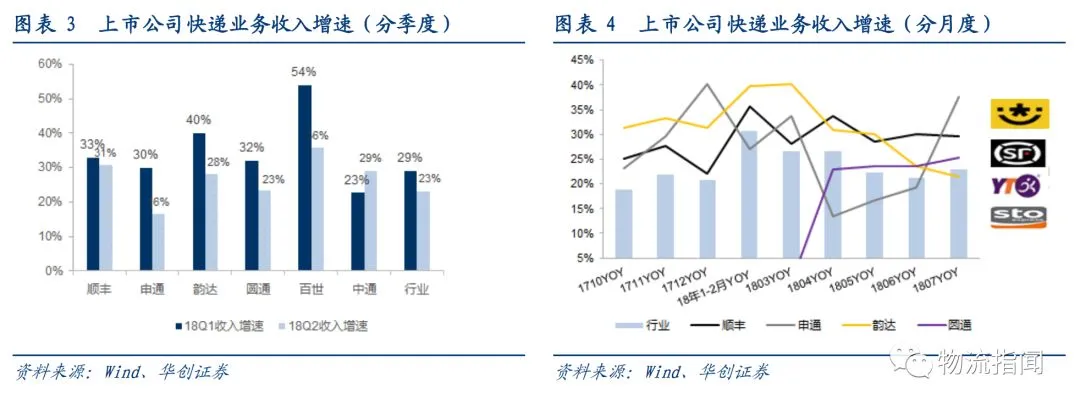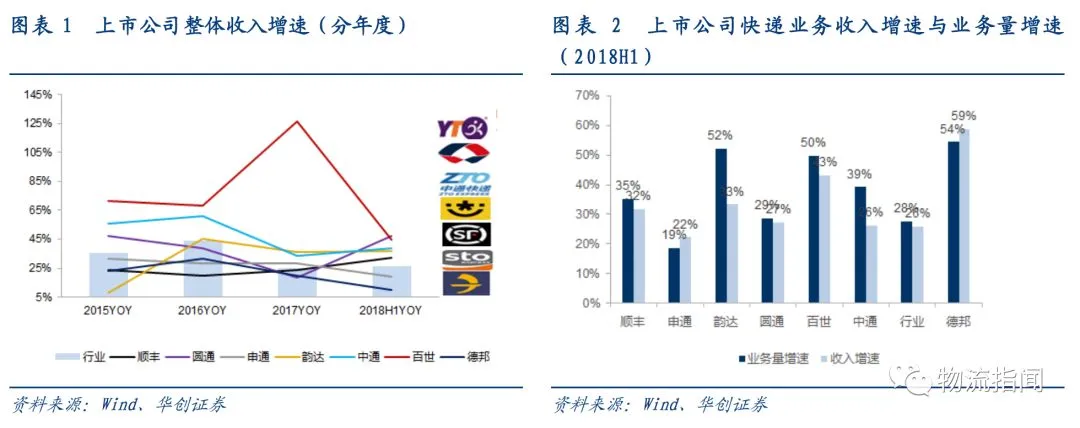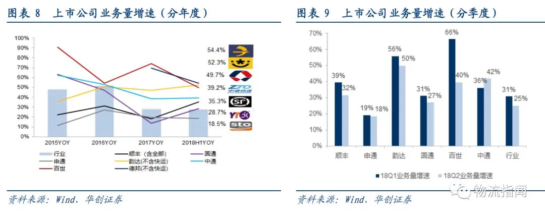 其中:德邦、韵达、百世增速领跑行业,百世增速较2017年明显下滑,顺丰由于经济件增速提升与新业务拉动,增速显著提升,圆通增速也较2017年显著改善。