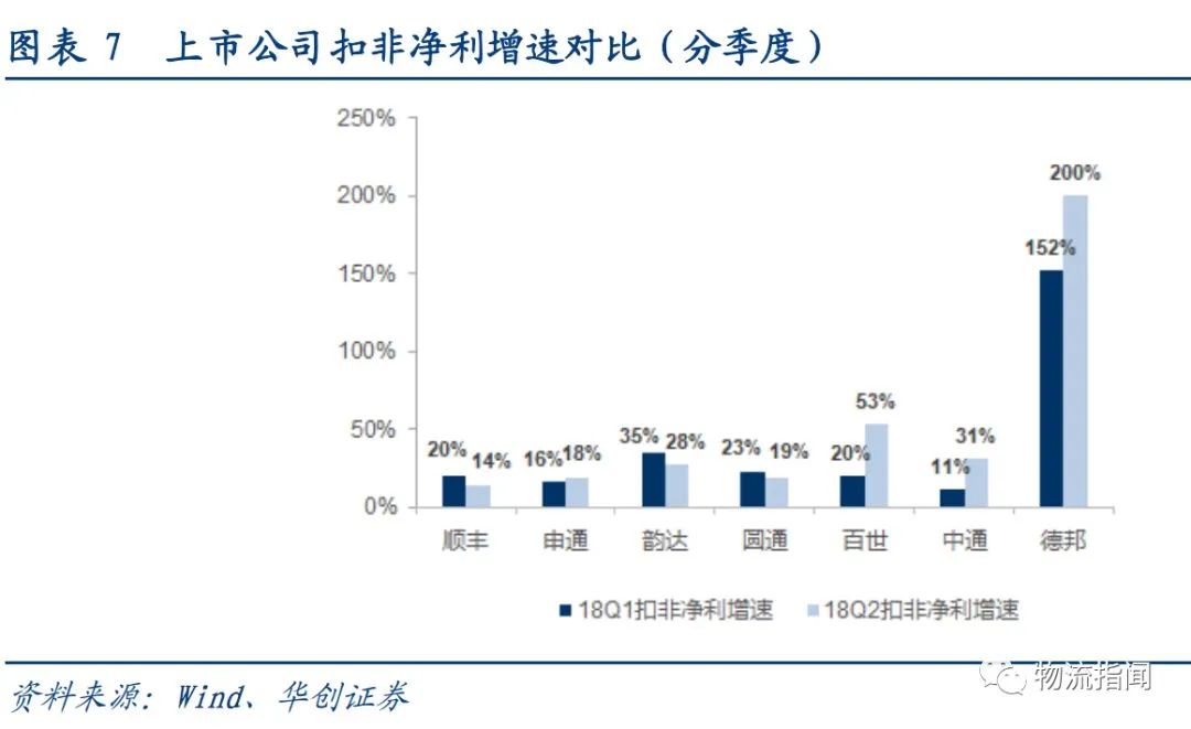 分季度看,韵达、顺丰、圆通的扣非利润增速Q2低于Q1,而德邦、申通、中通Q2增速高于Q1。