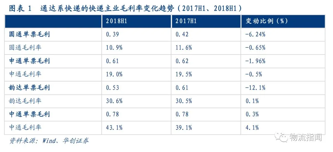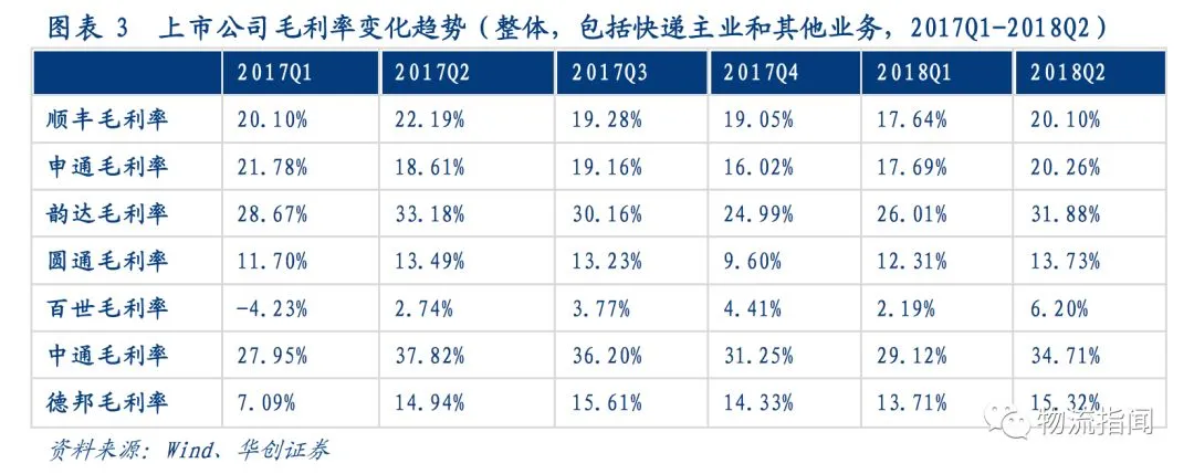 与去年同期相比,7家上市公司中,4家毛利率同比下降(顺丰、韵达、申通、中通),3家毛利率同比提升(圆通、德邦、百世)。