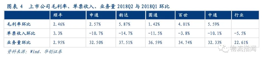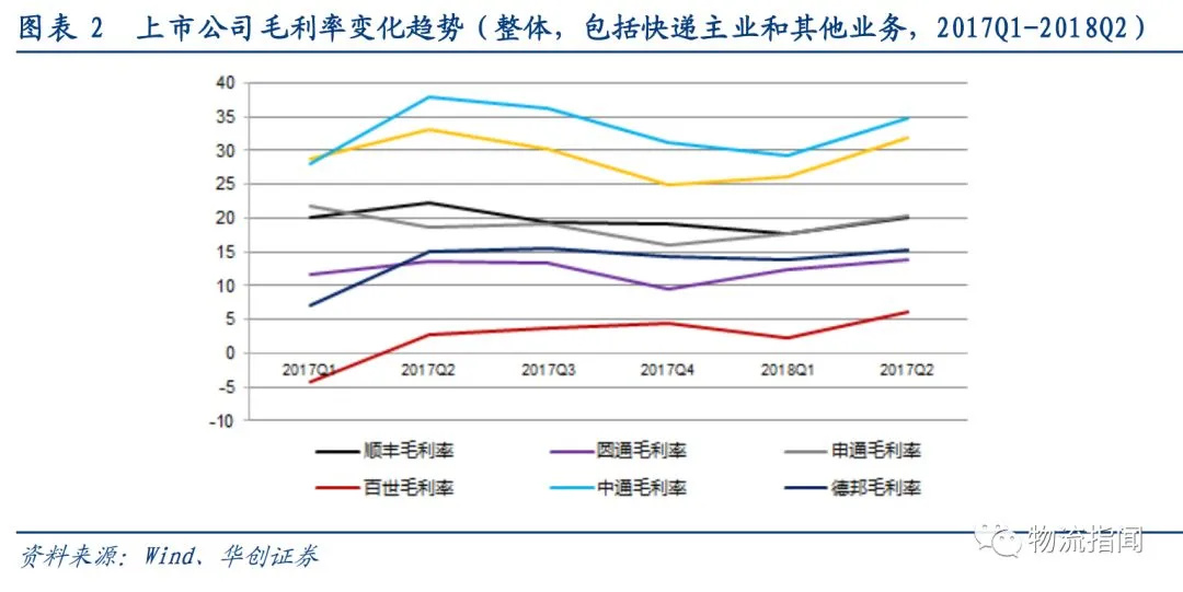 百世增速较2017年明显下滑,顺丰由于经济件增速提升与新业务拉动,增速显著提升,圆通增速也较2017年显著改善;从季度看,行业Q2增速较Q1下降6pct,其中百世增速Q2较Q1显著下降,中通增速逆势提升。