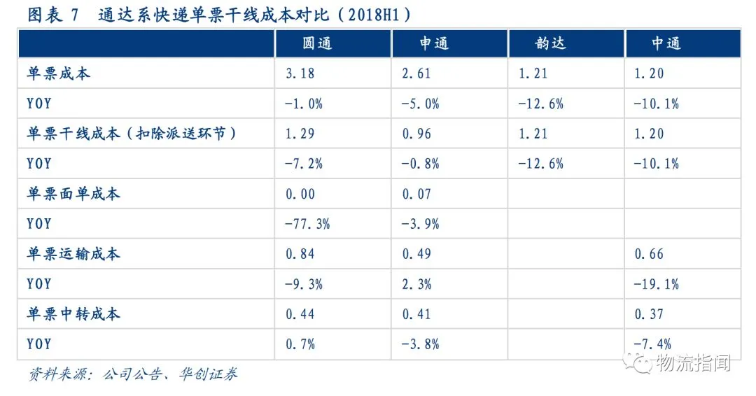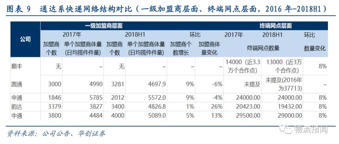 据此,我们从干线、渠道(加盟商)、终端三个层面对通达系快递进行对比,看18年上半年竞争优势变化和后续改善空间。