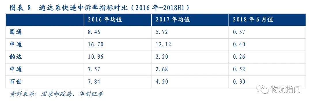 从国家邮政局公布的公司申诉率看,顺丰的申诉率持续保持领先,通达系龙头中通韵达的指标领先于通达系的指标于2018Q2逐月改善。