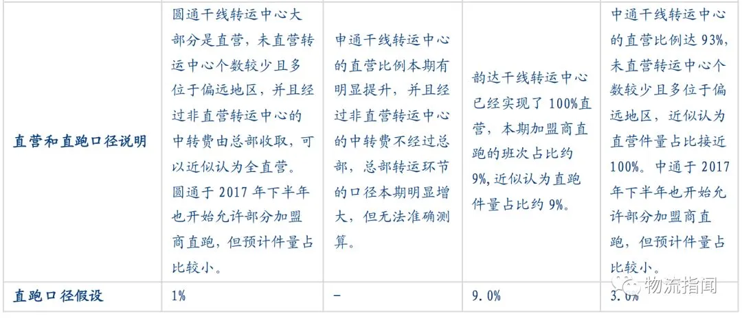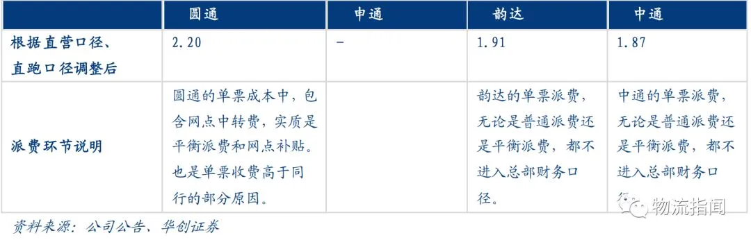 备注:根据派费、直营口径、直跑口径调整后,圆通、韵达、中通的单票收费近似可比,但考虑到业务量区域分布的不均衡,收费标准内部分布的不均衡,货物重量运距的差异,总部财务口径外的普通派费、平衡派费,目前仍然不能精确的横向对比各公司对加盟商收费标准的高低。