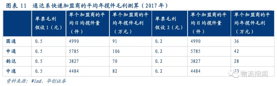 以通达系快递单个加盟商的平均揽件量计,假设单票揽件毛利为0.5元,则单个加盟商的年平均揽件毛利为70-106万元,假设单票揽件毛利为0.2元,则单个加盟商年君揽件毛利为28-42万元。