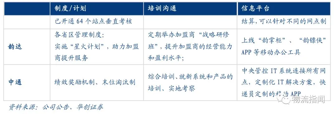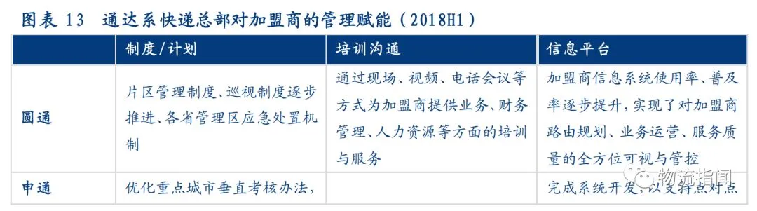 2018H1,为提升加盟商自身的管理效率,通达系快递从常态化制度、培训沟通、信息平台等多方面采取措施。