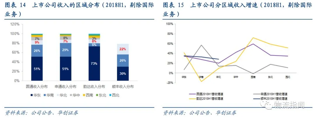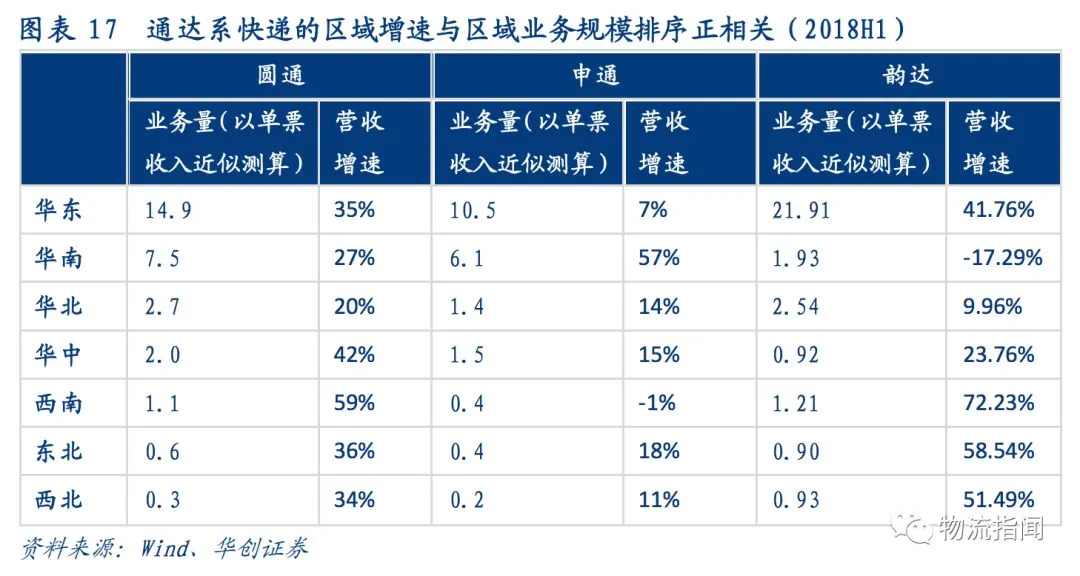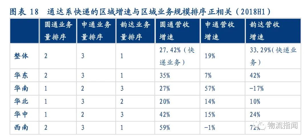 比如韵达在华东区业务量排序第1,收入增速居于首位;申通在华南区业务量排序第2且十分接近第1位的圆通,收入增速居于首位;圆通在华北区业务量排序第1,收入增速也居于首位。