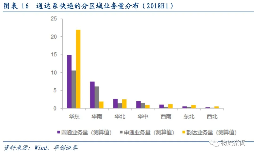 收入分布的不均衡:顺丰收入的区域分布比较均衡,华东、华南、华北的收入占比接近。通达系快递(圆通、申通、韵达),华东收入占比均超过 50%,其中韵达华东区占比高达 73%。
