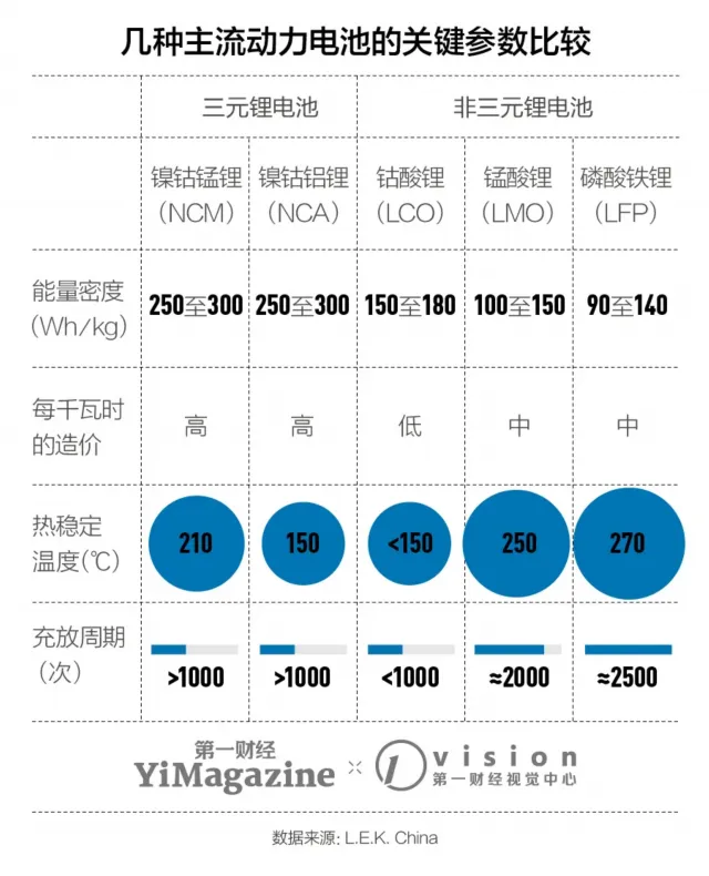 动力电池市场目前最常见的两类解决方案,一是三元锂电池,二是磷酸铁锂电池。两者间的主要差异在于电芯正极材料所用的合金——磷酸铁锂方案安全性好、成本低,但能量密度不高;三元锂方案能量密度高、耐低温,但安全性差、成本高。