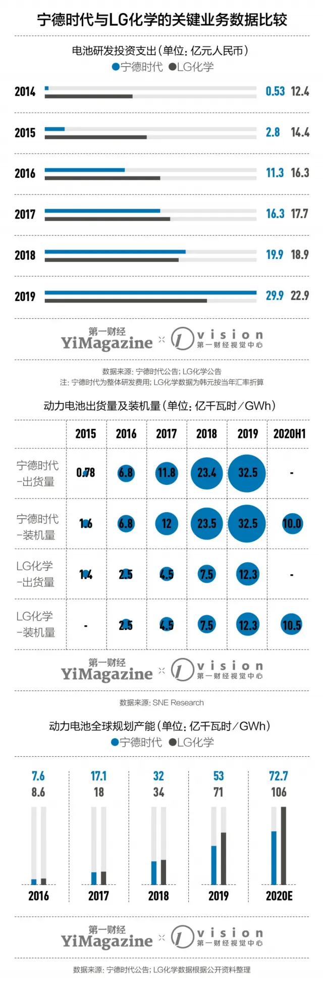 只是在本地化生产方面,宁德时代还要抓紧。LG化学的波兰工厂在2019年的产能已达30亿瓦时(GWh),相当于宁德时代全球最大生产基地60%的水平;宁德时代的德国工厂则受新冠疫情影响,建设进度有所延后。