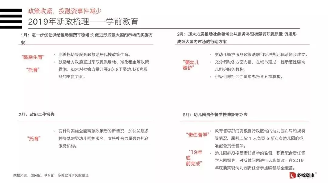 3)学前教育政策方面:对学前教育市场特别是幼教市场可以说是定向调控,明确了学前教育的民生属性大于市场属性,普惠和教育公平成为幼教行业关键词。然而市场需求未减,我们依然看好早教亲子、高端托幼、思维启蒙、幼儿园B端服务市场;但整体上幼教资产投资热度趋冷。
