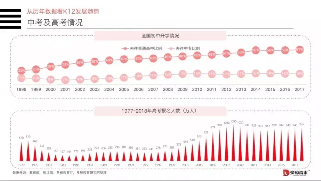 参培率明显提升。主要是升学竞争越来越激烈,虽然大学扩招导致大学升学率极大提高,但以985和211的优质高校的录取率并没有提升太多;另一方面,根据教育部的数据,初中升普高的升学率全国平均水平在57%(2017年),就算是上海这种一线城市也只在60%左右, 这意味着近40%的初中毕业生不能升入普通高中,只能分流至中专学校(18%)或者失学。无法升入高中对于目前的中国家庭来说几乎无法接受的事情,所以以一、二线城市为代表的家长已经把升学竞争从高中蔓延至初中甚至小学阶段。家长的教育焦虑情绪、校内优质教育资源的供给不足、家庭消费能力的提升以及以在线教育为代表的新学习方式导致近五年的K12课外辅导市场的参培率明显提升。