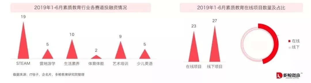 根据多鲸教育研究院统计,2019年上半年素质教育投融资事件为50起,与去年同期相比大幅下降,其中STEAM18起,生活素养及艺术培训赛道分别获得10笔及9笔。在线项目融资占比一步提升。2019年上半年在线素质教育项目占比上升,在线项目融资事件达到23起,占比46%,素质教育在线化成为赛道发展新趋势。
