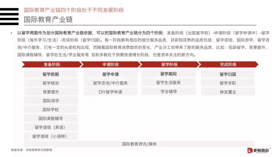 以留学周期作为划分国际教育产业链依据,可以把国际教育产业链分为四个阶段:准备阶段(出国留学前)-申请阶段(留学申请中)-留学阶段(海外学习/生活)-完成阶段(留学归国)。每一阶段都有相应的细分服务品类,目前较成熟的品类包括:留学语培、国际游学、留学咨询/中介服务,已有一定的头部机构出现,而随着国际教育消费趋势的变化,产业分工也带来了新的服务品类,比如:低龄留学、背景提升、国际课程辅导、留学后生活/学业服务等, 目前多数处于供需快速增长阶段,也是资本关注的新方向。