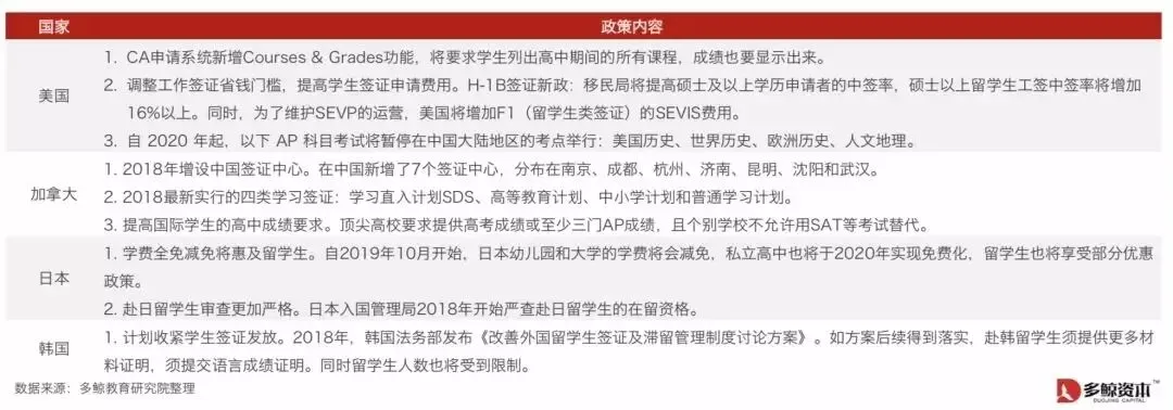2)整体上看,多数目的国留学申请门槛和留学成本在上升。根据多鲸教育研究院的统计,多国院校提高了申请学生的分数要求及材料完整性,对于语言成绩及高中课程学习成绩的提高门槛,同时申请费用和入学学费明显上调。一方面反映出中国大陆出国留学申请学生的整体水平已经提升,另一方面也反映出目的国对于生源质量的要求在提升。