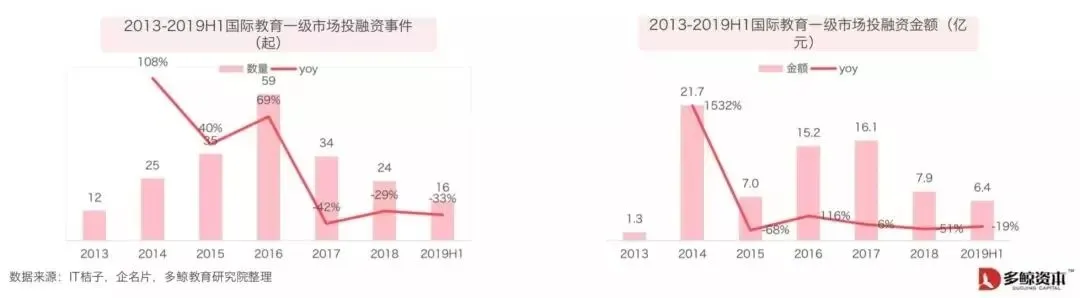 1)国际教育赛道投资热度并不高,并且有趋冷现象。根据市场公开数据,2013年至2019年上半年,国际教育一级市场共有203起融资事件,累计融资金额接近76亿元,平均单笔投资金额约3700万。其中2016年达到顶峰,全年59起,之后投融资案例连年下降,2017年和2018年融资事件不到当年教育行业总融资事件的10%,反映投资人对国际教育赛道的偏好并不高。
