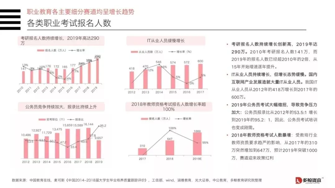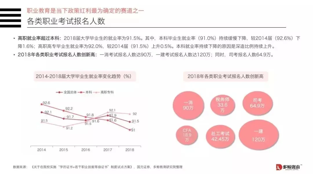 2)2018年各类职业考试报名人数创新高:一消考试报名人数达90万,一建考试报名人数达120万;同时,司考报名人数64.9万。