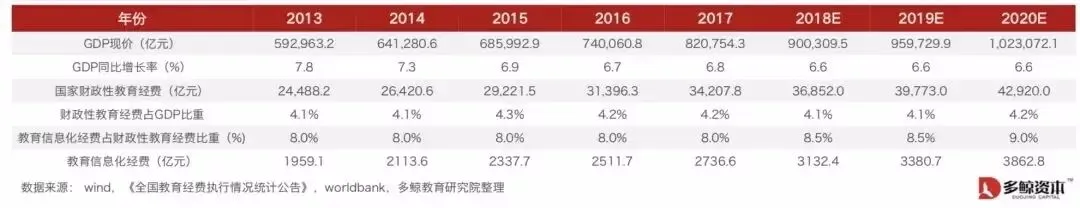 我国在教育信息化建设方面与发达国家存在较大差距。2017年,美国教育信息化占比达5.7%,而我国仅占4.4%。美国教育信息化每年大量投入基础建设,用以支持教育融合应用的发展。而我国教育信息发展近几年依然以基础建设(网络设备)和课堂硬件投入为主。2019 年 2 月,国务院印发《中国教育现代化 2035》,提出十大战略任务之一就是要加快信息化时代教育变革,建设智能化校园与一体化智 能化教学、管理与服务平台。明确提出要确保财政一般预算教育经费支出逐年只增不减,保证国家财政性教育经费支出占国内生产总值比例 不低于 4%。《加快推进教育现代化实施方案(2018-2022)》详细提出加快推进智慧教育创新发展、构建“互联网+教育”支撑服务平台等具体方案措施。并明确提出“各级政府在教育经费中按不低于 8%的比例作为教育信息化经费,2017 年中国教育信息化财政投入已超过 2700 亿人民币,预 计未来几年增速在 8-10%左右。