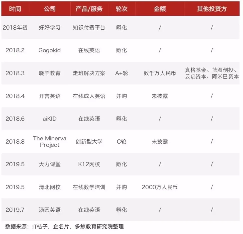 本次小鲸分享了多鲸ONE发表的《2019上半年教育行业投融资报告》。不管是用于学习了解教育行业,还是作为数据参考,都十分有用。小鲸也会不断地持续更新各种干货资料,请大家一直关注我们哦~本文为部分内容节选,完整版按照要求可得。