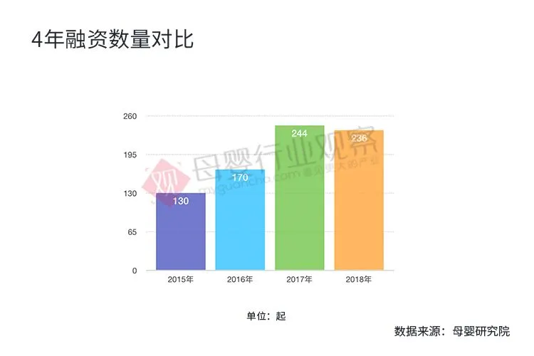 整体上,对比2015-2018这4年的母婴投融资市场表现,2017年相对而言是行业最暖的一年,融资数量与金额都创历史最高。一方面,消费升级、新零售成为推动母婴行业发展主动力,另一方面,得益于2016年国家二胎放开的政策推动,出生率创新高,使得母婴行业大火,被投资人一致看好。2018年母婴行业投融资虽然有所减少,但并未出现大幅下降。原因在于,母婴消费的特殊性决定了它受经济寒冬波动影响相对较小,科技创新领域虽会受一定影响,但反而寒冬会倒推某些技术在内部的快速发展。更为重要的是,妈妈和母婴系列产品和服务、二胎家庭和二胎经济、95后的消费者、三四线城市的消费升级、新兴渠道和母婴渠道、母婴新零售等多个方面仍存在巨大掘金机会,资本层面也依旧被长期看好。