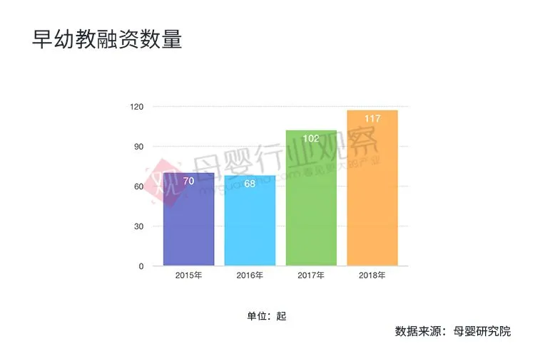 通过上述图表中的数据我们可以看出,近几年来人口红利的到来、项项利好政策的出台都刺激着早幼教行业市场大热,早幼教融资整体呈上升趋势,特别是从2016年到2017年的大跨越,实现翻倍式增长。非常明显的趋势是,85、90后新生代父母是科学育儿的中坚力量,对于孩子的早期教育有较高的消费意愿,且早幼教低龄化明显。据母婴行业观察统计,2018年全年亲子早幼教行业投融资共发生117起,达110.38亿元,资本对素质教育在线化认可度提高,少儿英语、生活素质教育、科创教育备受关注。