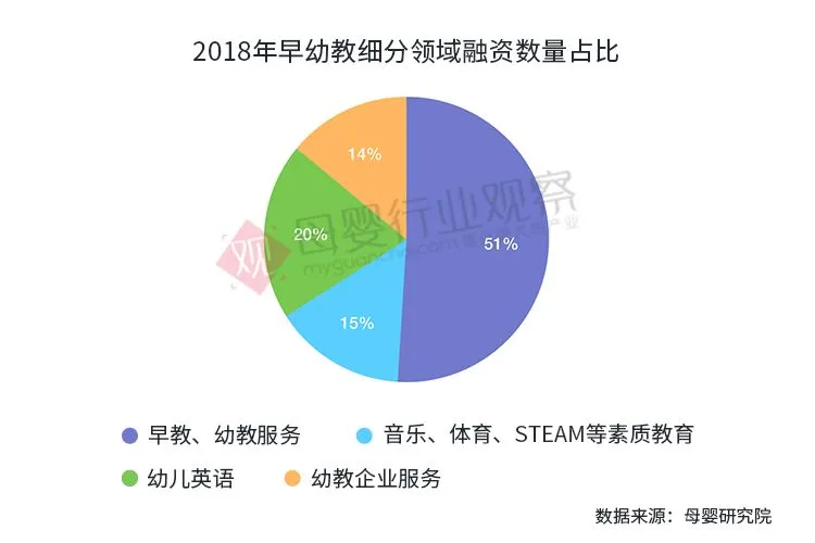 从细分领域展开来看,早教、幼教服务“吸金”热度最大,全年的融资事件共有60起,占整个早幼教行业投融资的51%;幼儿外语成为继早幼教服务外最大的黑马,2018全年融资事件为23起,占比20%,可以看出,幼儿外语培训势头正猛,不可小觑,如VIPKIDS、宝宝玩英语都是资本青睐的宠儿。此外,音乐、体育、STEAM等素质教育18起,占比15%。