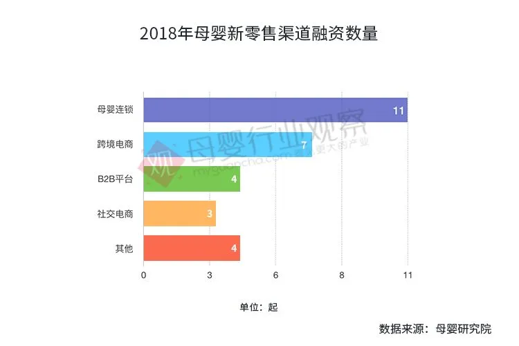 据母婴行业观察统计,2018年母婴新零售渠道投融资事件共计29起,达30.22亿元。其中,母婴连锁渠道有11起融资,跨境电商7起,B2B平台和母婴新渠道各4起,社交电商融资事件共3起。
