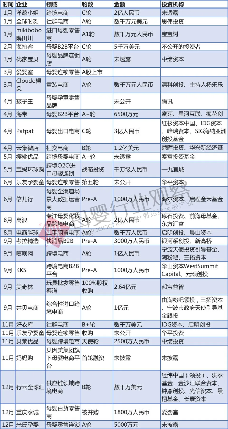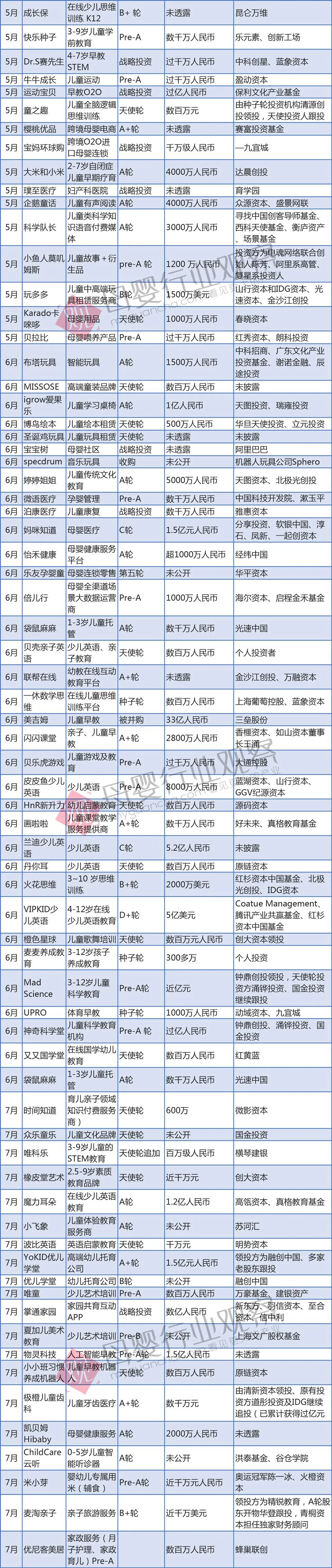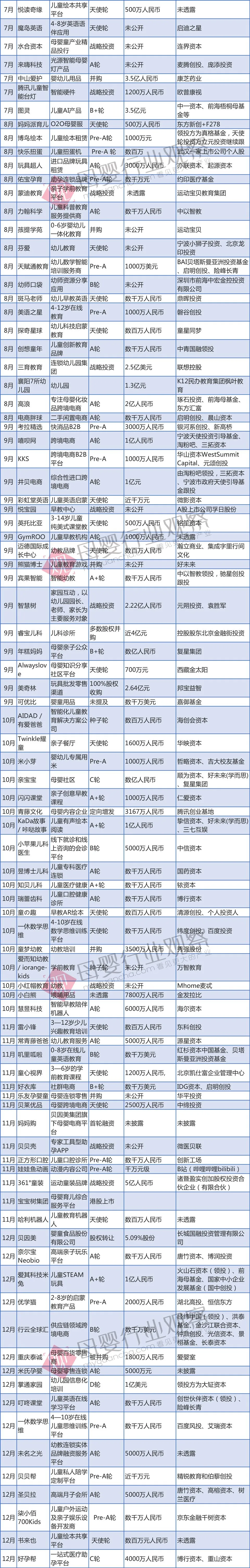 附2018年母婴行业全年投融资数据: