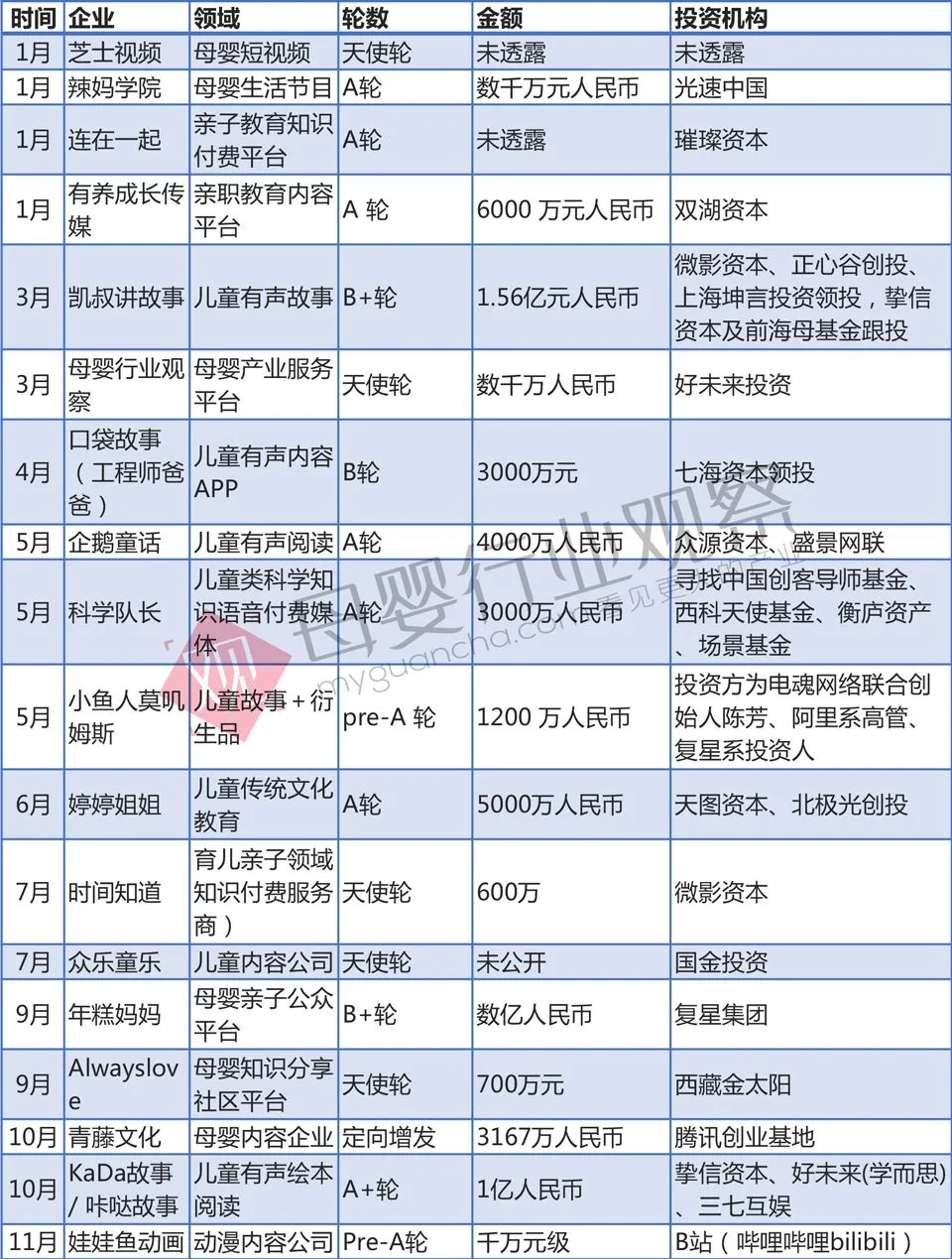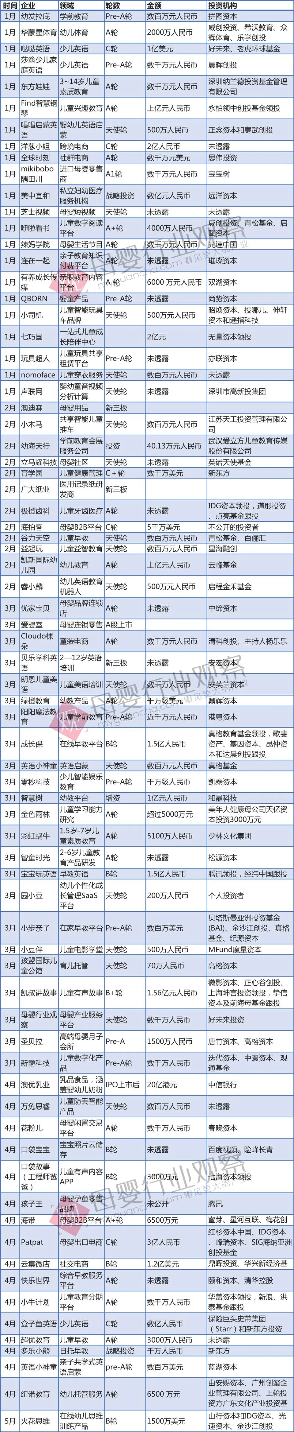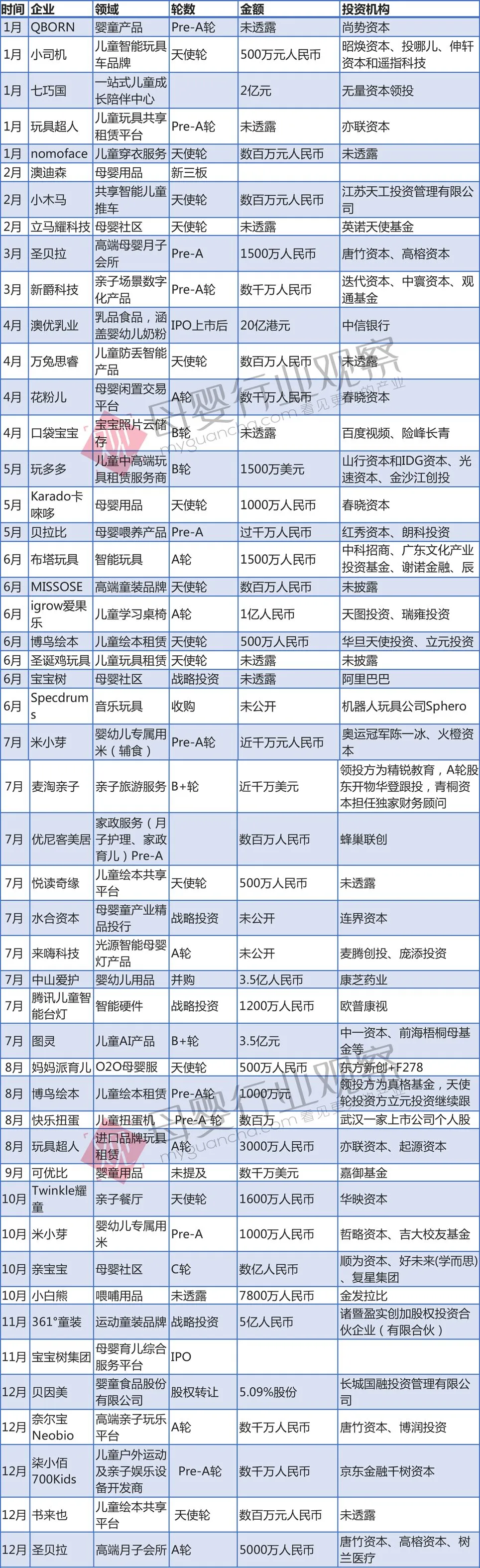 以下,我们从母婴各个细分领域来看这一年投融资市场的表现和变化。