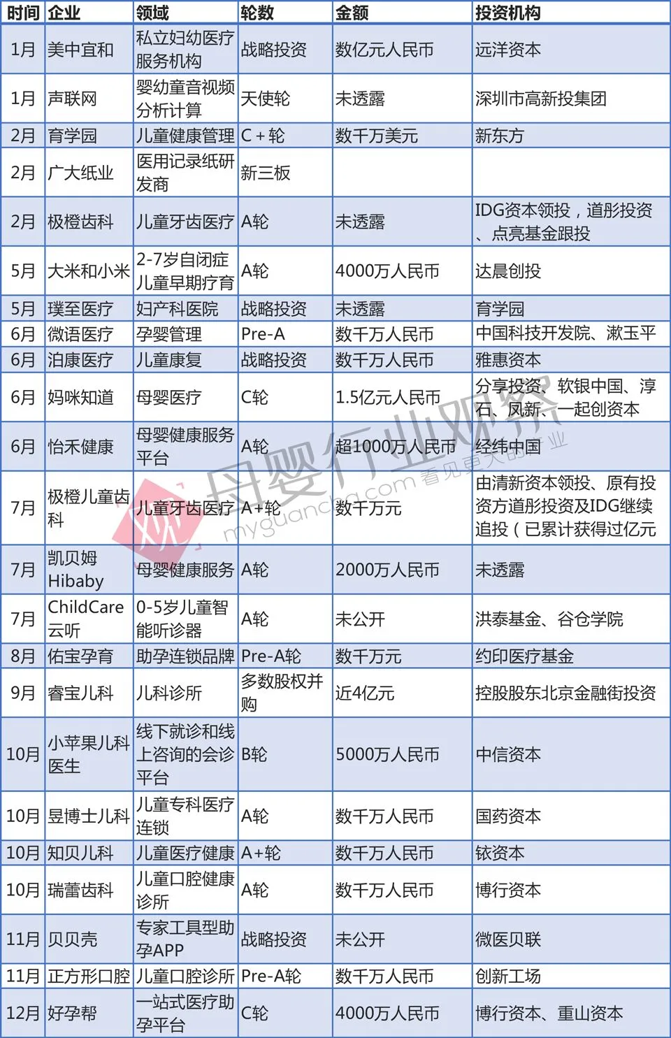 2018年孕产儿科医疗健康领域投融资数据: