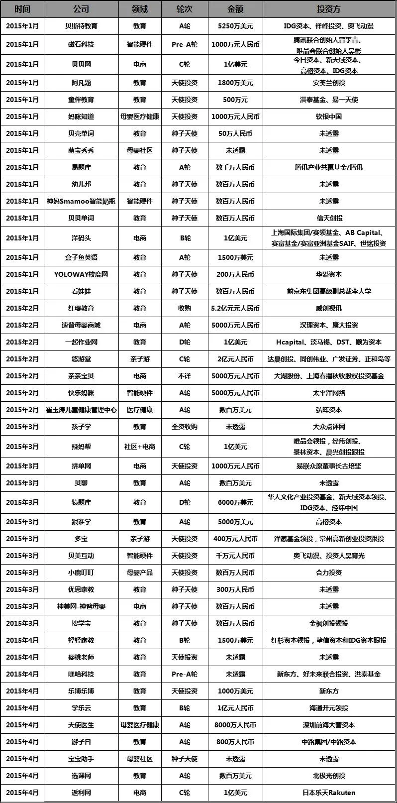 母婴行业观察根据市场公开信息整理最全2015年母婴行业投融资报告,2015年母婴行业相关投融资项目共130起,平均每个月近11起。从这个数字也可以看出,母婴行业依然非常火热,创业者情绪高涨,投资人热钱涌动。