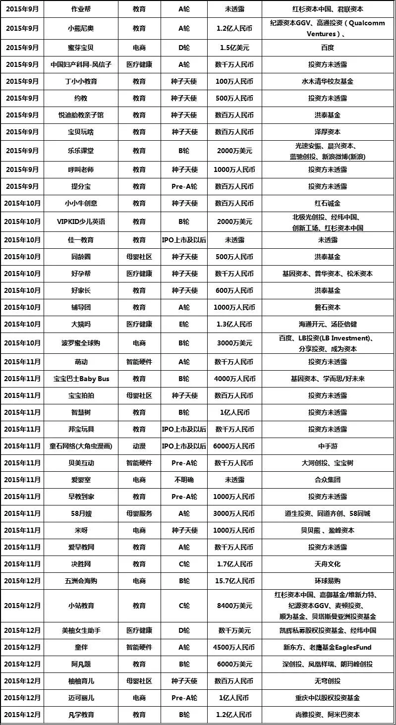 2015年上半年非常火热,下半年母婴行业依然火热,最少从下半年投融资发生的数量来看,并未受到所谓资本寒冬的影响,不过关于这一点,我们也接触过一些创业团队,他们的融资确实因为所谓的资本寒冬估值打了折扣。从数量来看,母婴行业投融资全年都是在高产中,6月份之前和6月份之后没有任何影响,所谓的资本寒冬,在母婴行业体现并不明显,下半年母婴行业投融资并没有放缓,不过细节上还是有变化,风投的偏好或者说投资方向变了。
