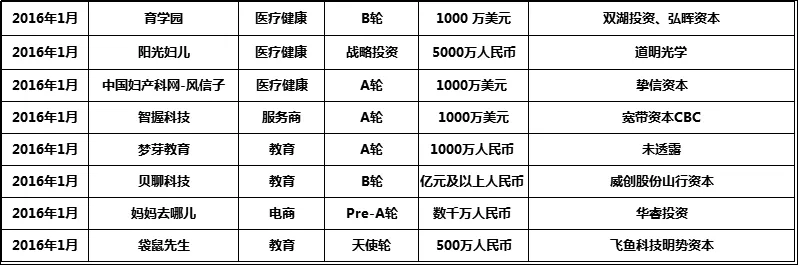 母婴医疗健康会是下一个热点吗?2015全年投融资达到8起,另外2016年1月份就有3起,看来2016年会继续大热。尤其是下半年,母婴医疗健康越来越被风投青睐。关于母婴医疗健康母婴行业观察专门预测过:母婴行业观察之前专门跟进过这个领域,目前来看母婴医疗健康是个不错的突破口,获得投资的几个项目的投资机构都是全球顶级VC,用户增长速度都很快。母婴医疗健康面对的问题——整合能力以及运营能力。母婴圈与医疗圈的整合能力,线上与线下的整合能力,跨界的运营能力等等。其实更深层次的关键点是:信任。不一一展开,后面我们会持续关注。详情见:《危机来了,市场冷了,母婴行业呢》