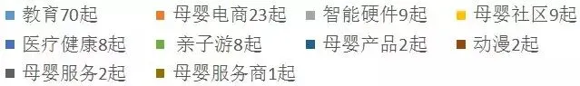排名第一的教育70起,遥遥领先,这个结果可能出乎很多人的意外;排名第二的是母婴电商23起;第三,智能硬件和母婴社区分别是9起,第四,母婴医疗健康、亲子游分别8起,母婴产品、动漫和母婴服务分别2起,母婴服务商1起。从数据我们也可以看出,母婴服务类获得投资的机会更多,不过服务类还是很分散,没有一家或者几家独大的局面出现,服务类项目的发展与竞争还有很长的路要走,也意味着母婴服务类本身还是有很多问题以及还会有不错的机会出现。