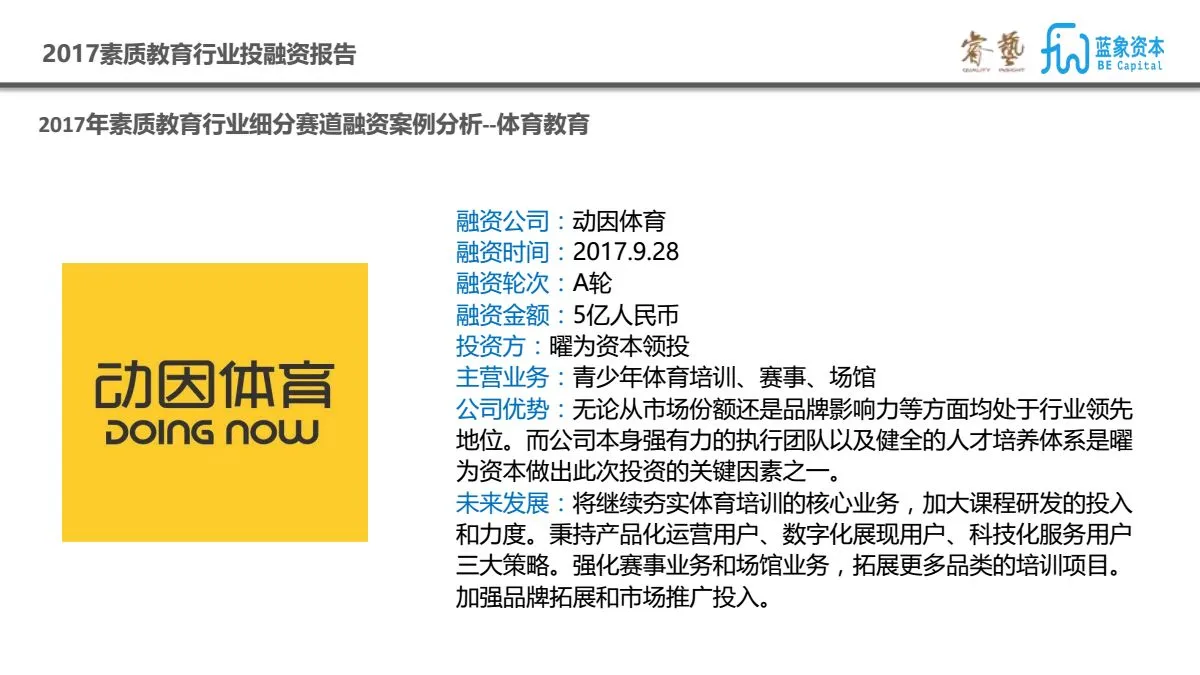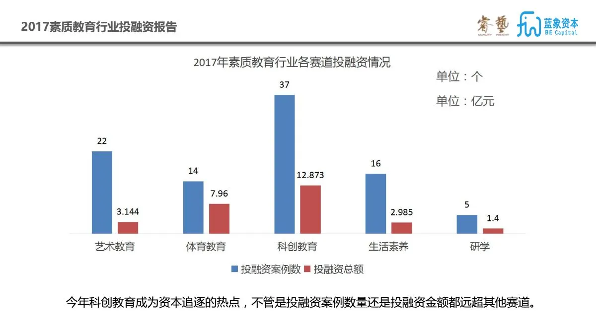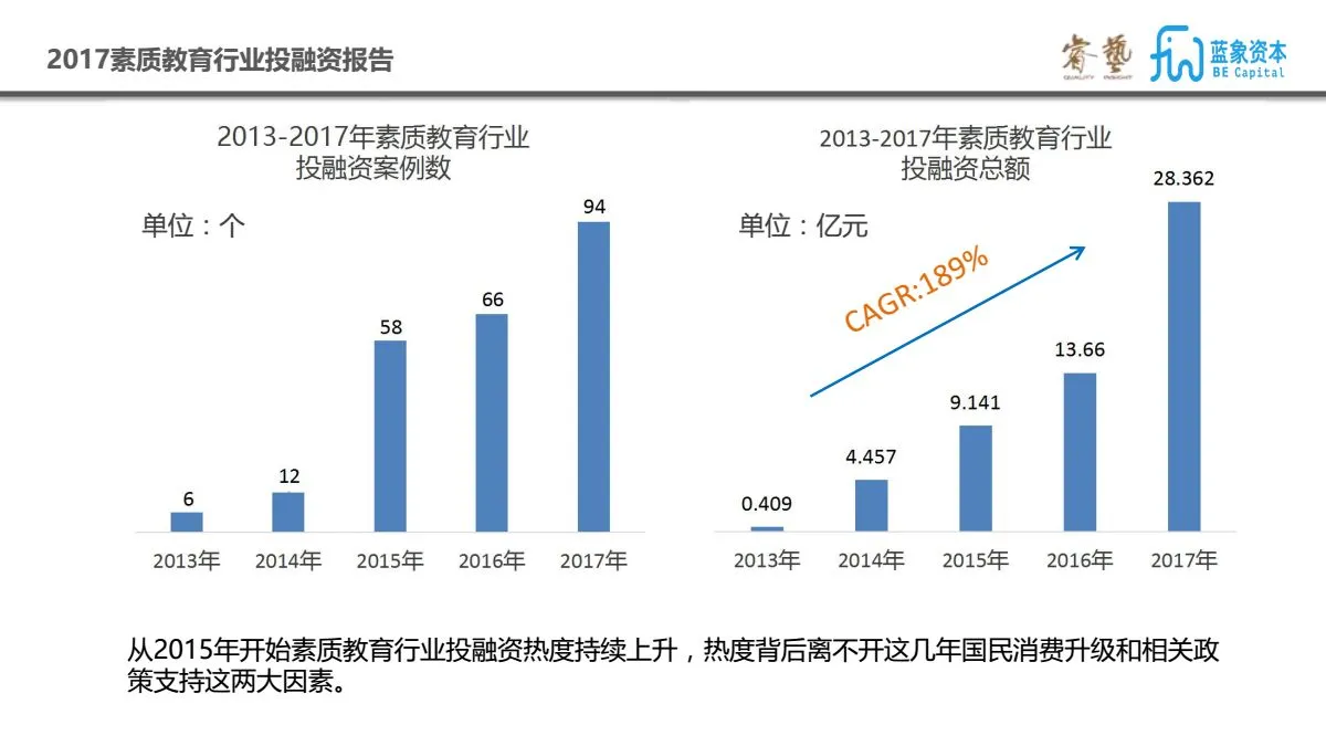为此睿艺联合蓝象资本发布了《2017素质教育行业投融资报告》,对近五年素质教育行业的投融资情况进行了梳理和盘点,也对今年的投融资热点和代表性案例进行了分析和解读,希望借此能为2018年素质教育行业的发展脉络提供一些借鉴。此次报告的数据整理和调研分析由睿艺和蓝象共同完成,以下为报告预览部分。