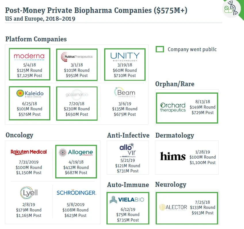 在投融资周期的另一端,平台公司和肿瘤学公司仍然占据公司最高估值,M&A和IPO的主流。SVB的报告指出,2018-2019年间,估值最高的15家私有生物医药公司中10家属于平台公司或者肿瘤学公司。其中6家公司已经通过IPO上市。