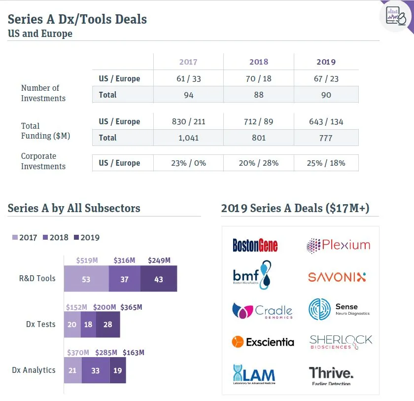 在诊断测试(diagnostic tests,Dx Tests)领域,A轮融资的数目和金额与2018年相比,都提高了50%以上。尤其在液体活检领域,投资人仍在持续对新兴液体活检公司进行投入。2019年度诊断/研发工具领域10大A轮投融资交易中有3项与液体活检公司相关。其中,Thrive Earlier Detection公司在开发名为CancerSEEK的早期癌症筛查检测,基于对循环肿瘤DNA中基因组突变和血浆中与癌症相关的蛋白生物标志物发现多种癌症类型。