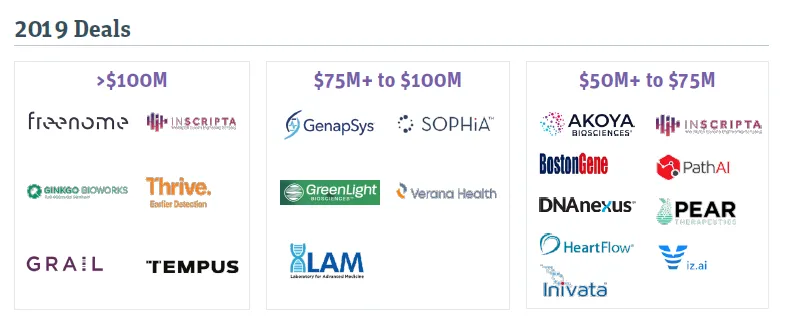在2019年,对诊断/研发工具领域的所有轮次投融资中数额最大的交易统计也显示出投资者对诊断测试领域的重视。GRAIL、Thrive Earlier Dection, Freenome都完成数额超过1亿美元的融资轮。这些公司都专注于开发用于癌症早筛的液体活检。