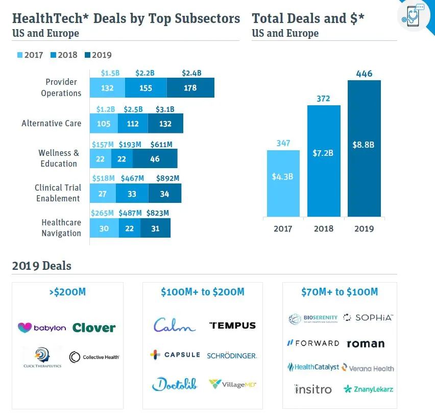 健康科技领域的投资在2020年将继续增加,SVB预计在2020年成功IPO的公司中将有更多健康科技公司,尤其是提供替代护理手段的公司。