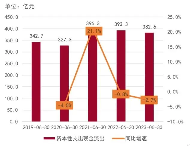 图4:2019-2023年上半年A股上市旅游企业资本性支出现金流出