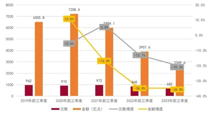 图5:2019-2023年前三季度文化和旅游产业投融资市场融资次数与金额情况