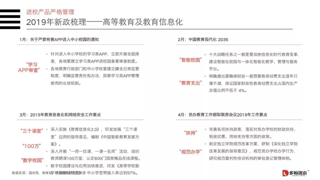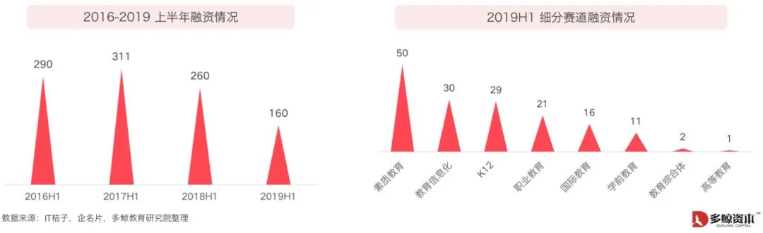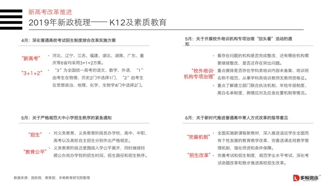 导言:2019年上半年,教育行业投融资发生了哪些变化?教育政策走向透露了哪些顶层思考?教育各赛道今年上半年表现如何,未来是否保持延续性?结合数据和行业观察,多鲸资本教育研究院发布《2019上半年教育行业投融资报告》将从8个方面对上述问题一一进行解读,包括:教育行业新政、资本市场概况、六大赛道概况。多鲸资本认为教育行业进入政策频发期,背后的根源是教育产业化进程加速,主要教育赛道处于不同的发展阶段,资本存在明显的偏好。下文为报告内容,欢迎关注“多鲸ONE”公众号,回复H1获得《2019上半年教育行业投融资报告》高清PDF版本。