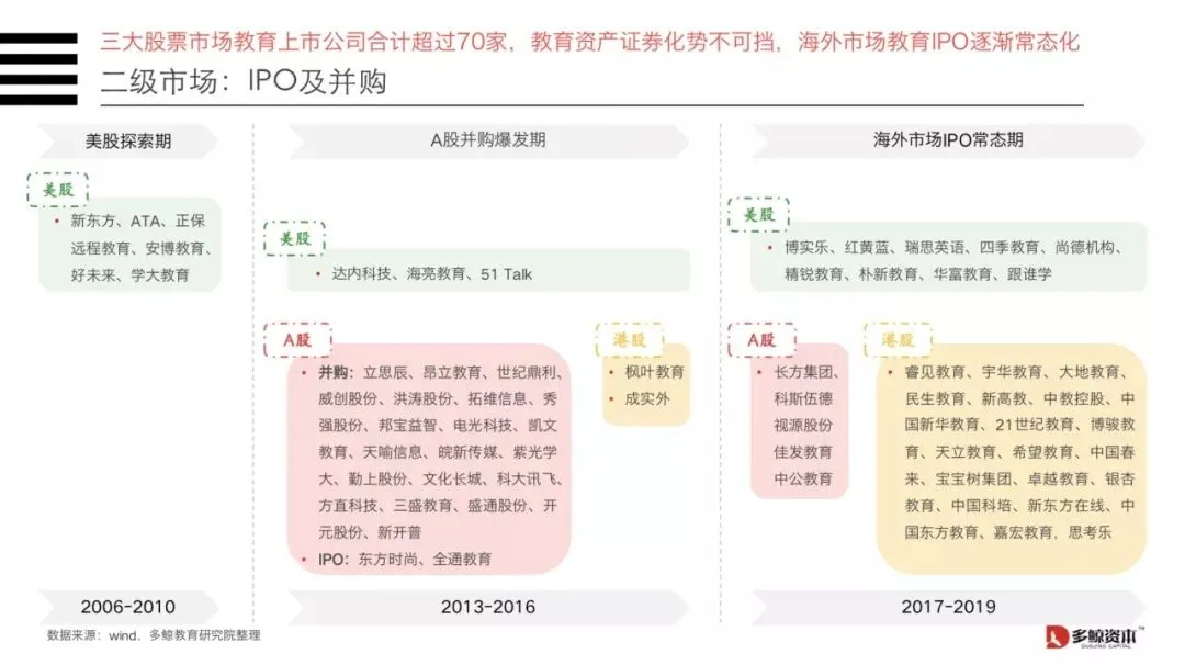 2.2 三大股票市场教育上市公司合计超过70家,教育资产证券化势不可挡,海外市场教育IPO逐渐常态化